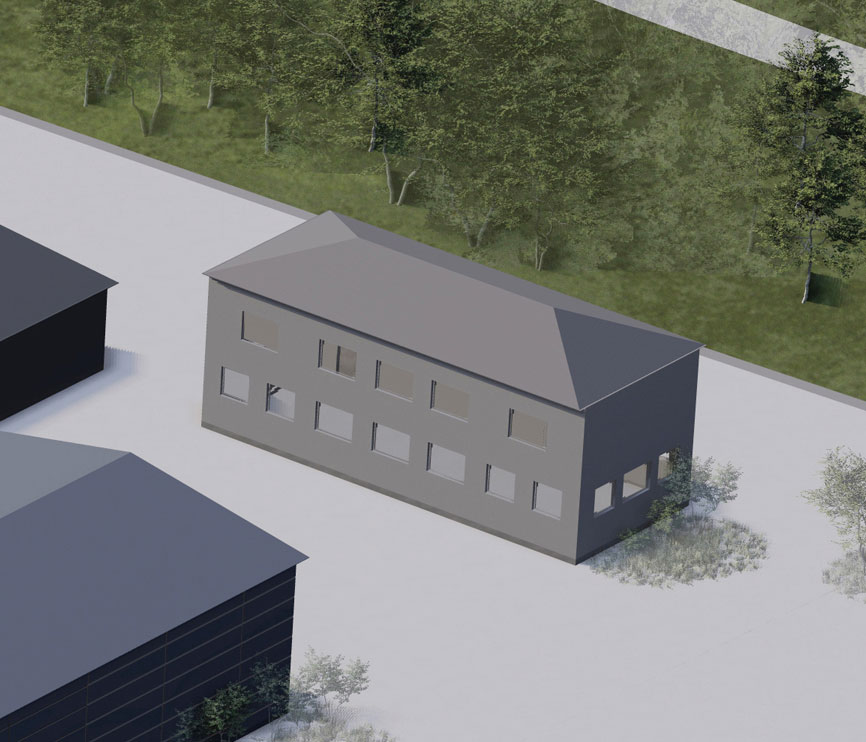 Trzykondygnacyjny budynek biurowo-produkcyjny z reprezentacyjnym holem wejściowym wykonany w technologii szkieletowej żelbetowej.